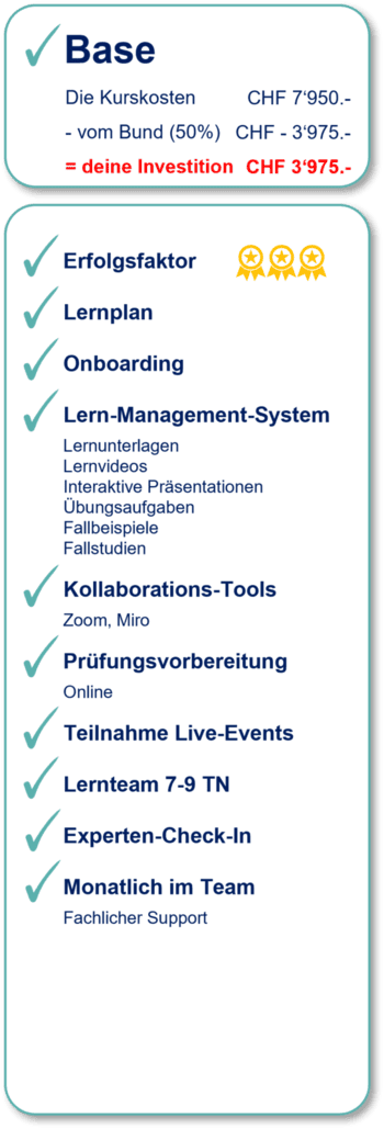 Base: Du lernst strukturiert und flexibel – ideal, wenn du eigenverantwortlich arbeitest und einen klaren Lernplan suchst. Du erhältst Zugang zu unserem Lern-Management-System, digitalen Lernmaterialien und monatlichem Fachaustausch im Team.