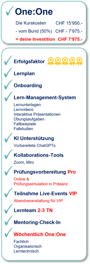 Die Kursgebühr für die Vorbereitung auf die Modulprüfungen und die Prüfung zum Führungsfachmann oder zur Führungsfachfrau beträgt CHF 11'950.- (Paket Professional). Bitte beachte, dass die Gebühren für die Modulprüfungen und die Fachprüfung des Berufsverbandes nicht in dieser Summe enthalten sind. Solltest du zusätzliche Einzelbetreuung wünschen, wird diese individuell vereinbart und separat in Rechnung gestellt. Mit dieser transparenten Kostenstruktur ermöglichen wir dir eine klare und realistische Planung der finanziellen Aspekte deiner Weiterbildung. So kannst du dich voll und ganz auf dein Lernen konzentrieren, ohne von unerwarteten Kosten überrascht zu werden