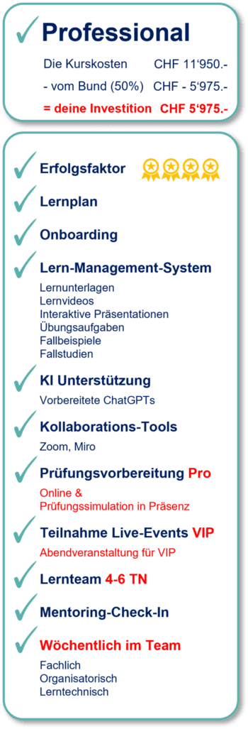 Professional: Du profitierst von einem starken Lernteam und wöchentlichem Mentoring in der Gruppe. Zusätzlich bekommst du Zugang zu vertiefter Prüfungsvorbereitung inklusive Simulationen – der ideale Mix aus Eigenständigkeit und Unterstützung.