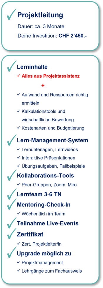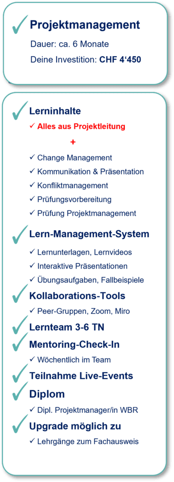 - Absolvent/innen der Kurse Projektassistenz und Projektleitung, die ihre Führungskompetenz vertiefen und auf strategischer Ebene wachsen wollen